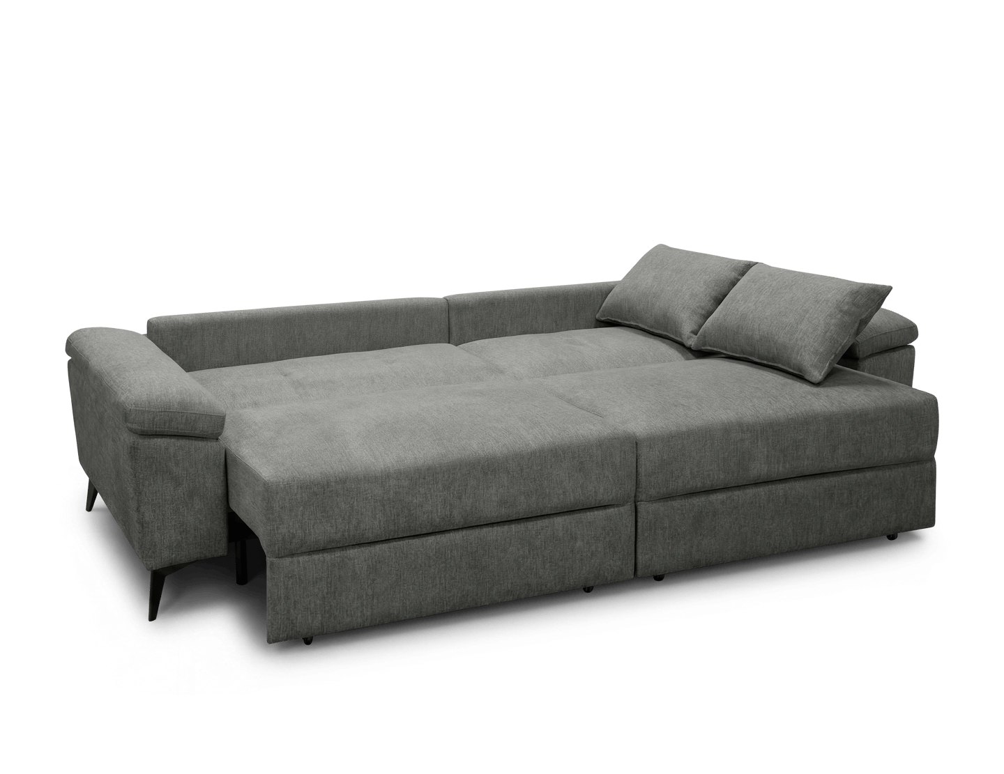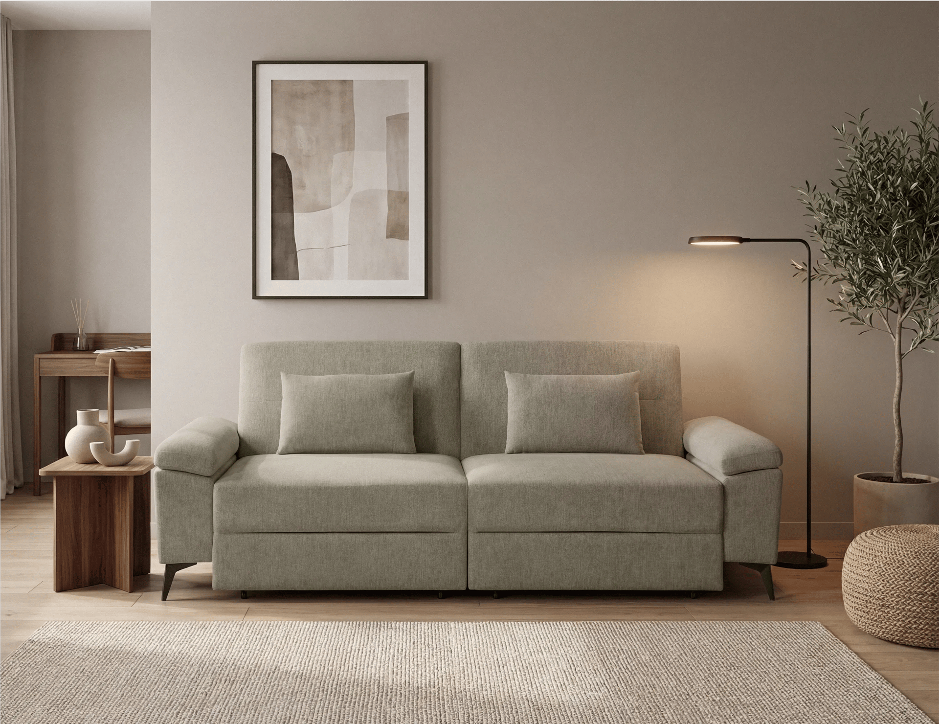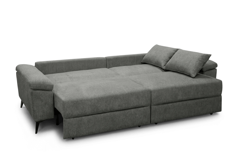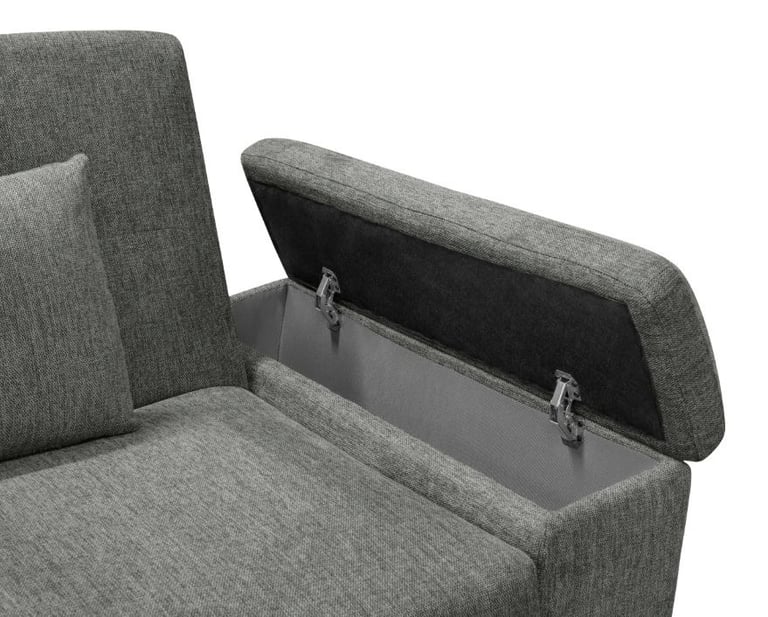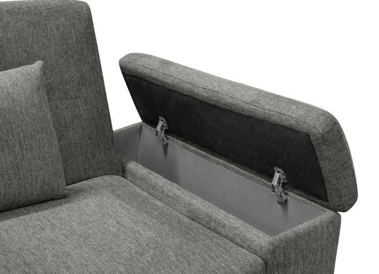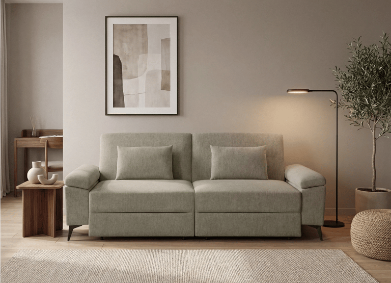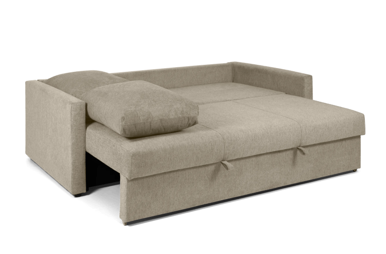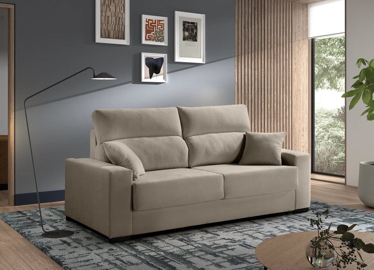 El model Camaro combina funcionalitat i versatilitat en un format sofà-llit amb sistema carro lliscant i obertura Click-Clack. Està fabricat amb estructura de fusta i contraxapat i entapissat en tela BREGO antitaques. Incorpora seients amb HR de 28 kg i molls ensacats, aportant adaptabilitat i bona recuperació a l'ús diari. Els braços integren bagul interior d'emmagatzematge, afegint un espai pràctic addicional, i es completa amb pota metàl·lica en acabat negre mat. Inclou 2 coixins decoratius que completen el conjunt.