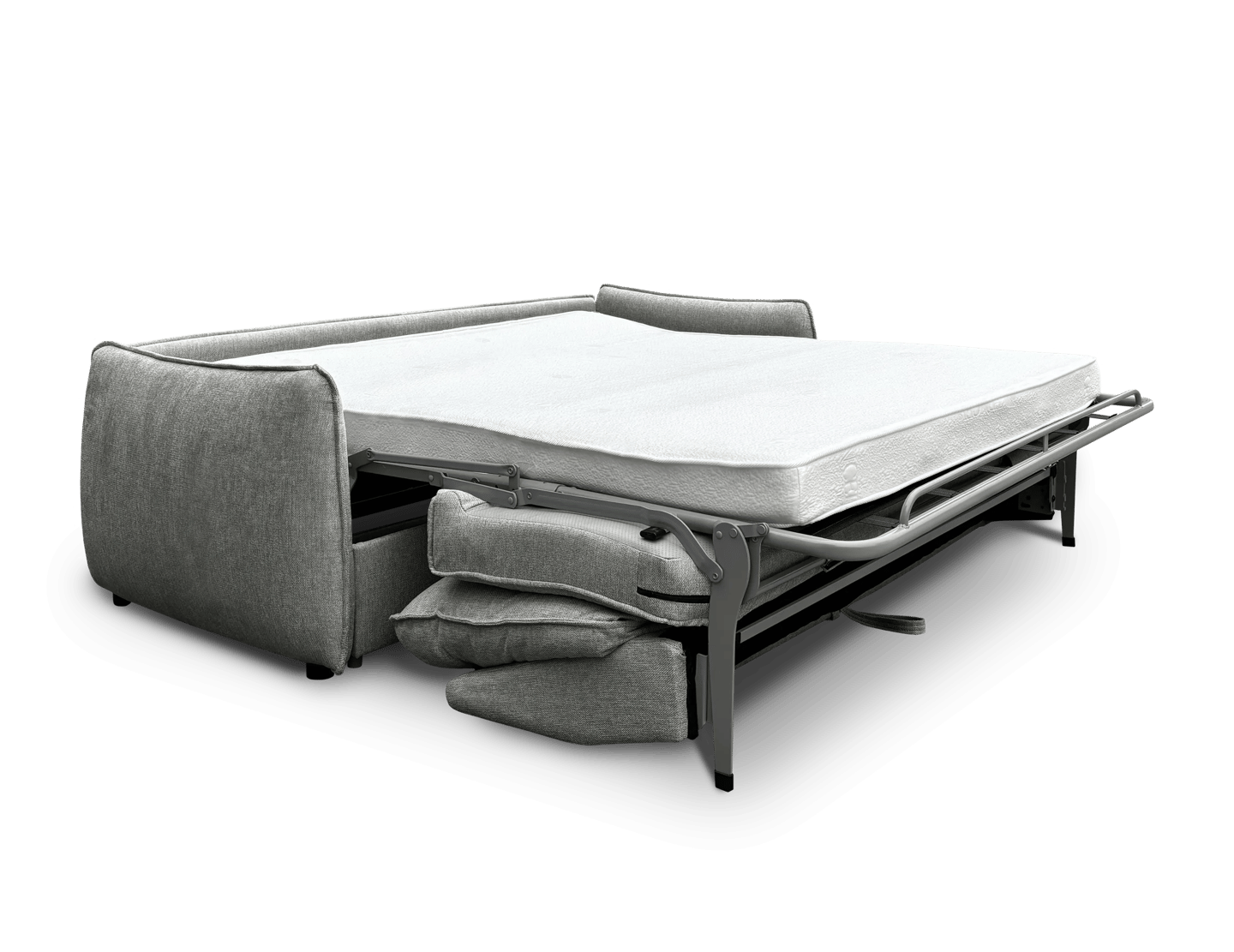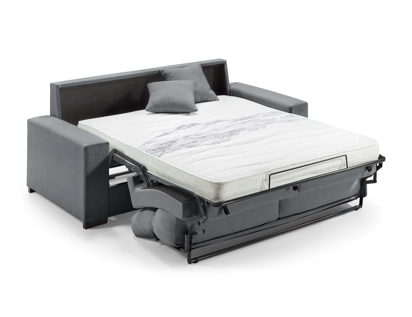 Els respatllers i coixins estan farcits de fibra buida siliconada, els seients incorporen escuma HR de 25kg suau, i el matalàs també és HR 25kg amb 12 cm de gruix, oferint un descans confortable. Compte amb suspensió de malla electrosoldada, és totalment desenfundable i inclou 2 coixins decoratius i potes de fusta en color negre.